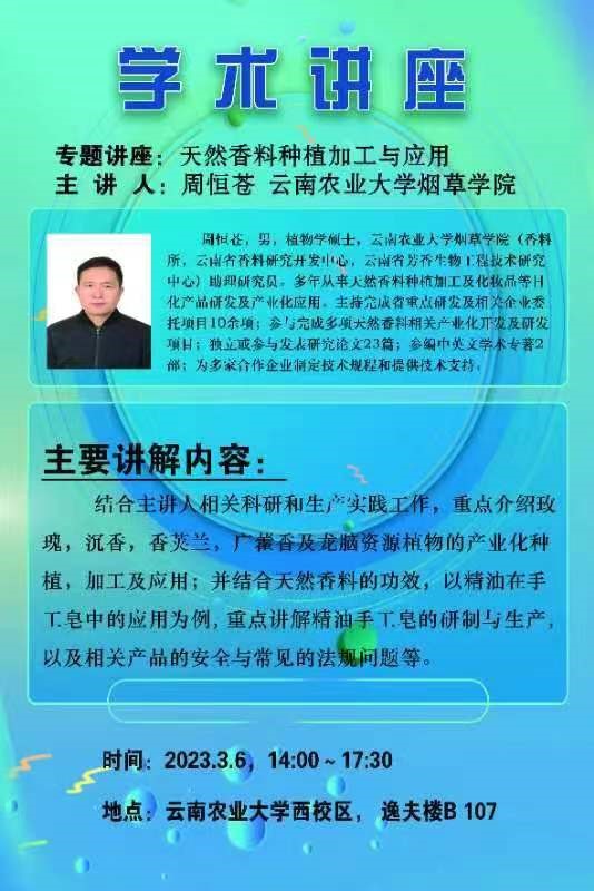 为增进开运 师生对香料香精行业发展动态与科技前沿的了解,开运 于2023年3-6月邀请校内外专家开展相关专题系列讲座。希望大家积极参与。