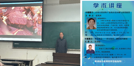 2023年3月到4月初我院邀请了合作企业导师云南瑞升烟草技术(集团)有限公司常务副总经理刘维涓研究员,云南悦馨香料科技有限公司创新应用部、技术生产总监骆荣君高级调香师,以及云南绿宝香精香料股份有限公司常务副总经理罗雁华高级工程师,云南云烁科技有限公司烟草工程高级工程师肖选虎,我院香料所的周恒苍、夏凯国、张劲松、易清元和任洪涛老师走进《香料香精专题》课堂, 联手为开运体育 师生开展了《一场与香料的对话》、《天然香料的开发与应用—以香茅为例》、《云南特色香料&天然香料品控管理》、《功能载香材料在卷烟中的应用》、《天然香料种植加工与应用》、《云南天然香料产业的历史回顾与前景展望》、《香氛美学—香氛鉴赏、调香案例解析》、《云南香料植物资源及其利用》、《茶香与茶叶香气研究进展》等一系列精彩纷呈的讲座和报告,获得全院师生的一致好评。