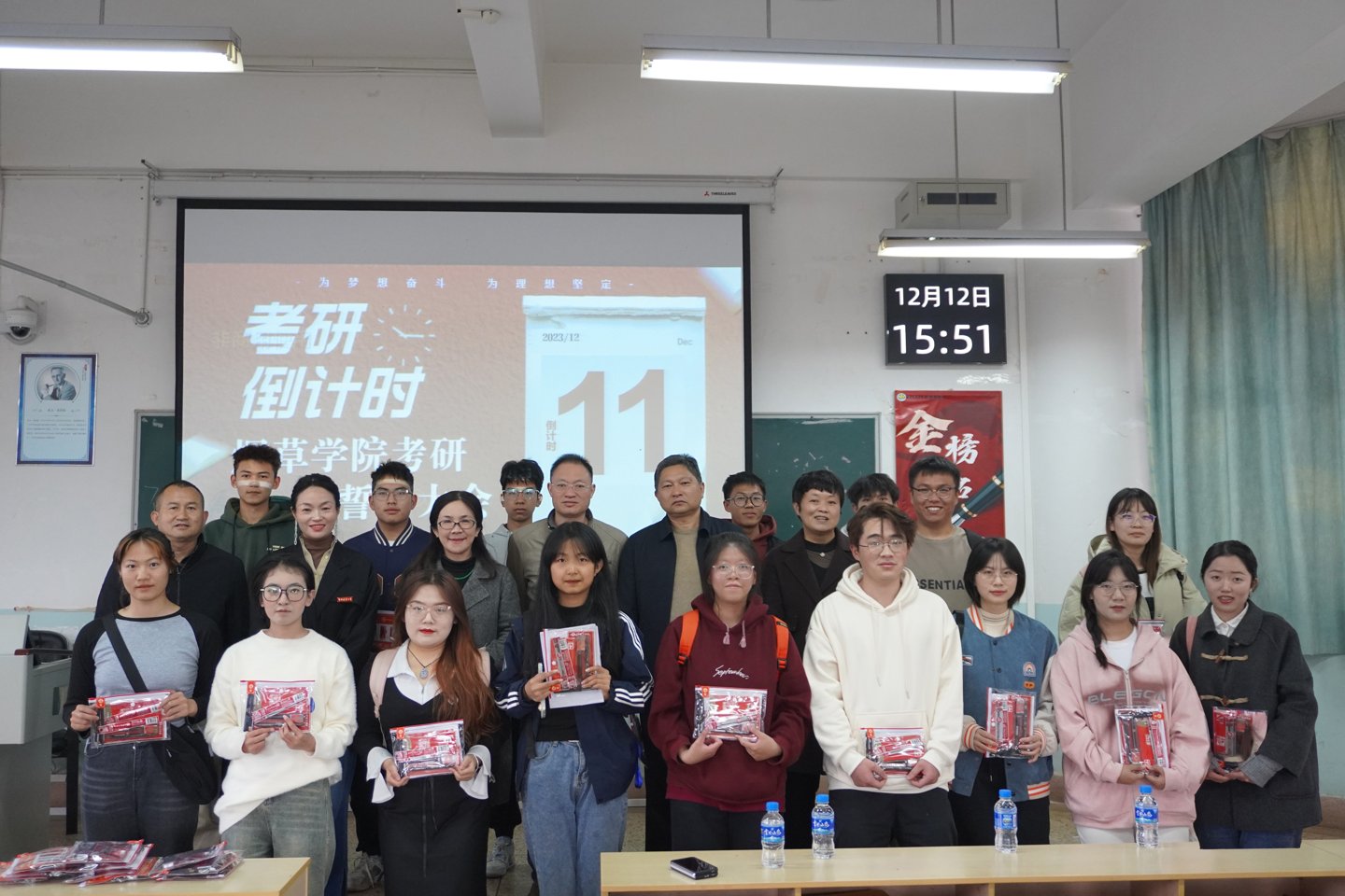 2024届考研誓师大会在尚农楼3-16教室举行。院党委书记李作森、院长刘雅婷、组织员陈建斌、院党委副书记王丽萍、副院长王娜、学工办主任谭正新以及2020级全体考研学子参加此次活动。