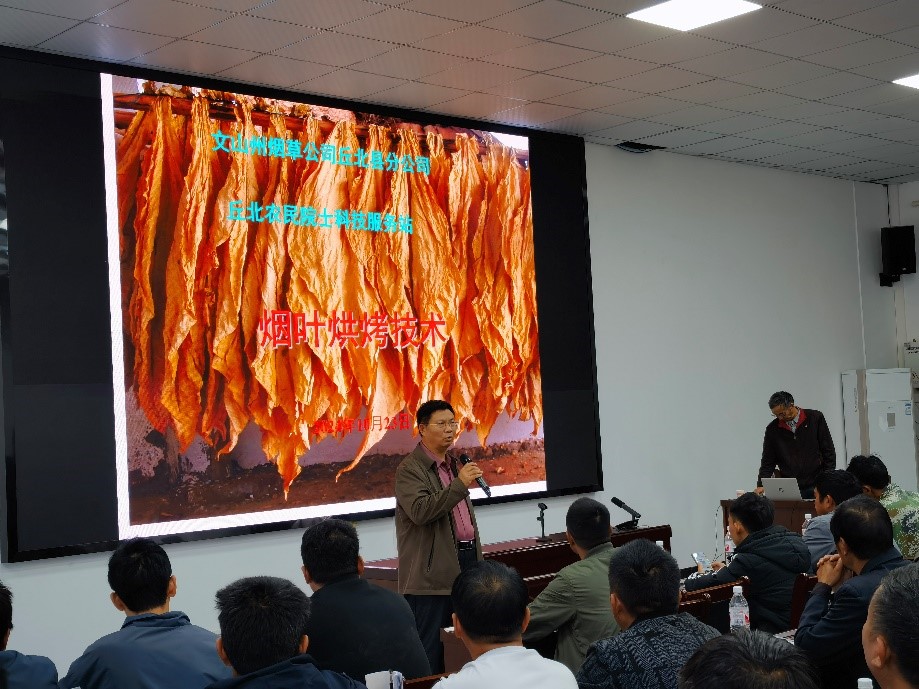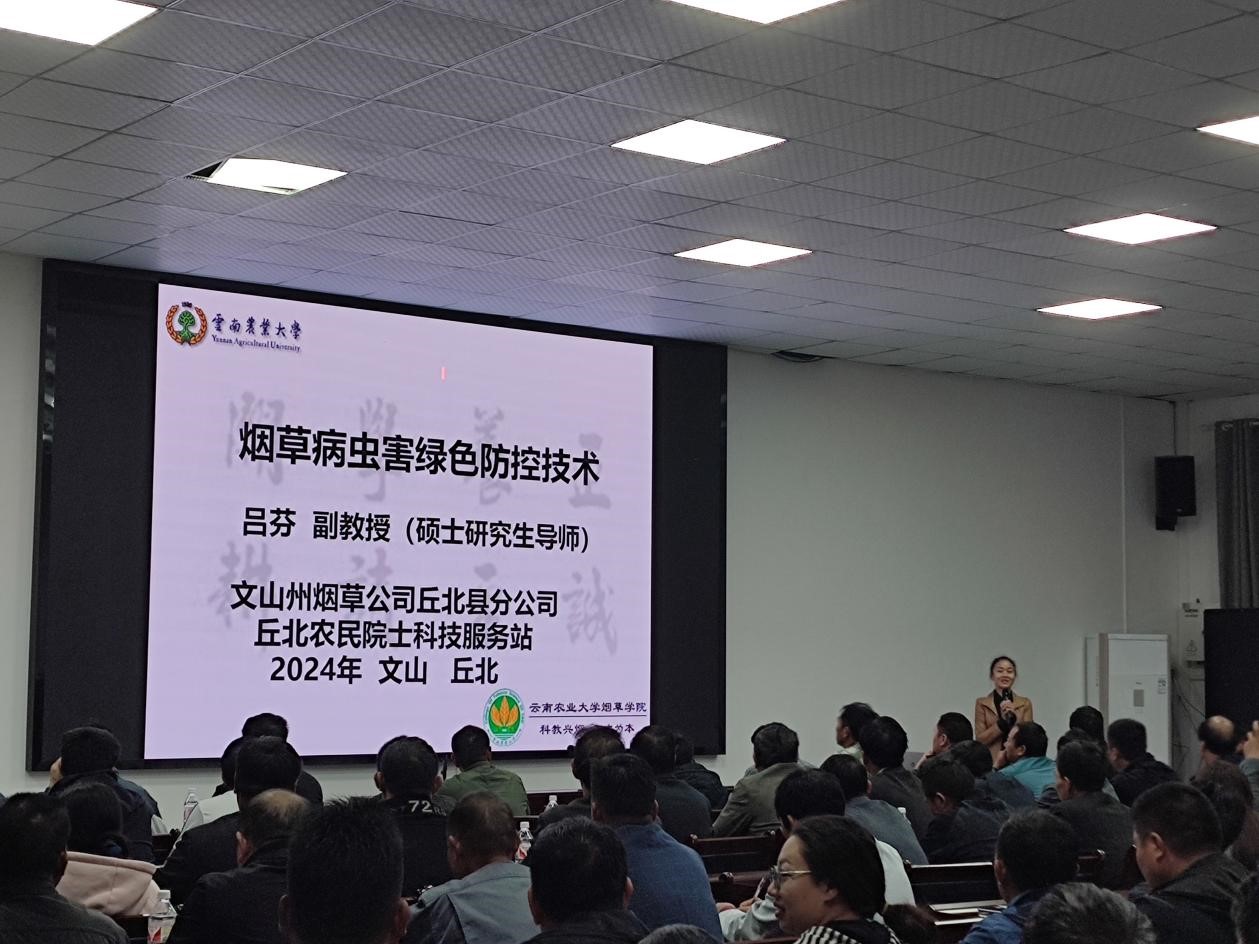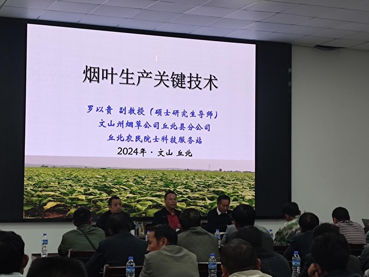 2024年10月21日至23日,丘北农民院士科技服务站联合丘北县人民政府烟草产业办公室和文山州烟草公司丘北县分公司共同举办烟叶生产关键技术和烟粮协同促农增收模式培训会。会议在农民院士科技服务站内举行,培训内容包含烟叶生产关键技术,以烟为主、烟粮协同促农增收模式,烟草病虫害绿色防控和烟叶烘烤原理与烘烤工艺等方面的技术,培训对象为丘北县各乡镇烟农合作社烟草科技员(辅导员),培训共计举办四场次,612人次参加。
