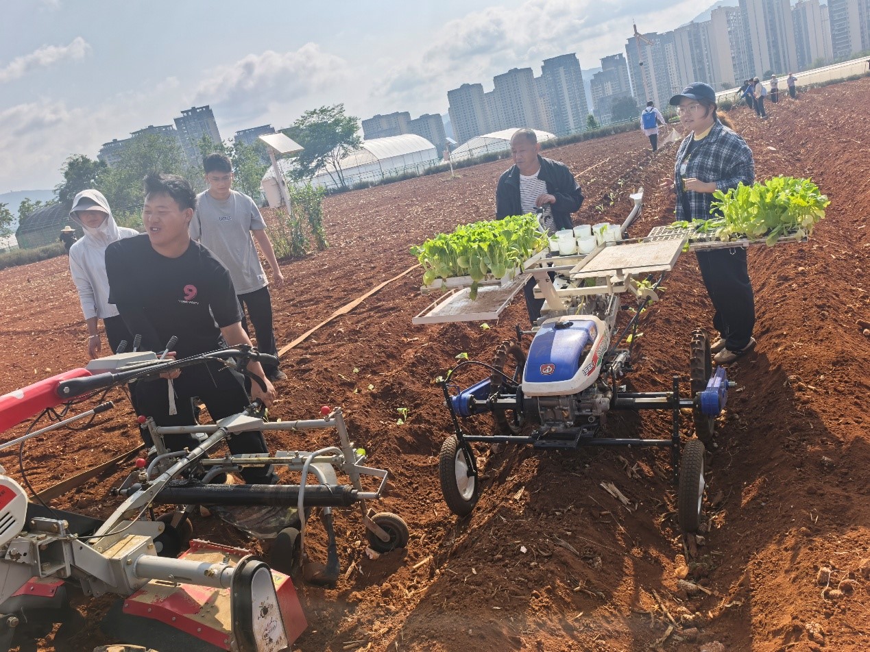 伴随着机声轰鸣,党员教师驾驶新型旋耕机、起垄机开展机械化整地作业,通过智能导航设备控制行距与垄高,确保田面平整、土壤疏松,为后续移栽奠定基础。随后搭载移栽辅助系统的机械设备上场,打孔、投苗、覆土一气呵成,配合人工辅助校正,实现“机械为主、人机协同”的高效移栽。
